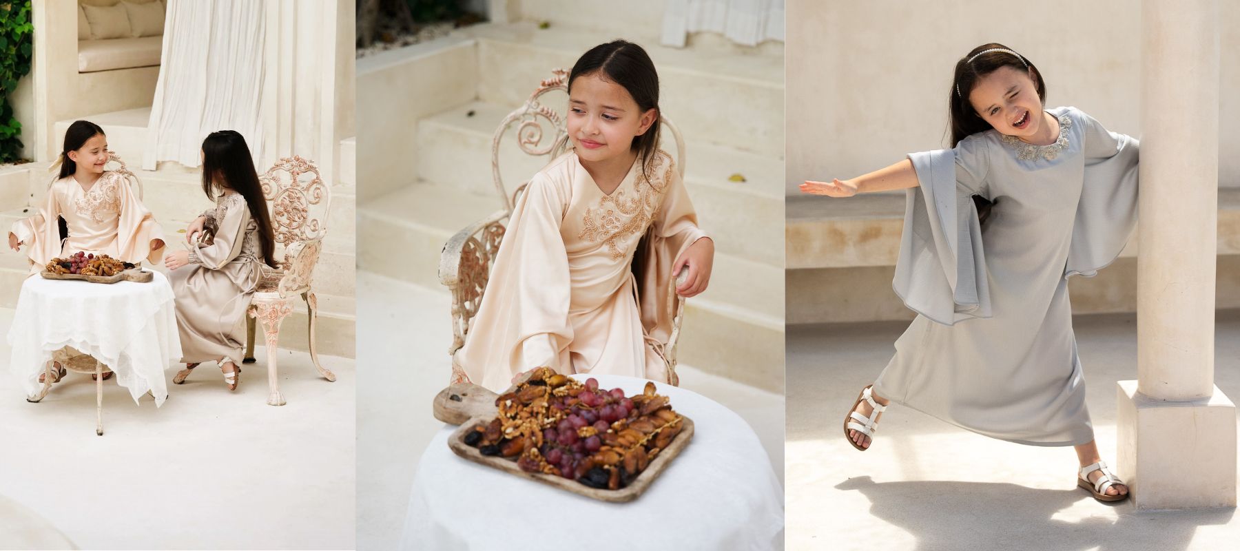 Explore our charming collection of kids' abayas and baby dresses, designed for you to match effortlessly with your little one.
