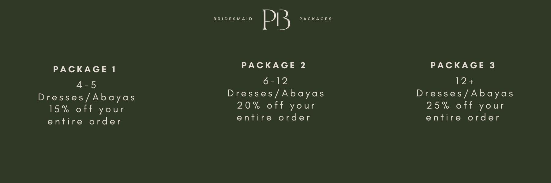 We're happy to be able to offer discounted packages on dresses and abayas from our available stock, and on occasion may be able to take orders if certain sizes are out of stock, and we have enough of a lead time.