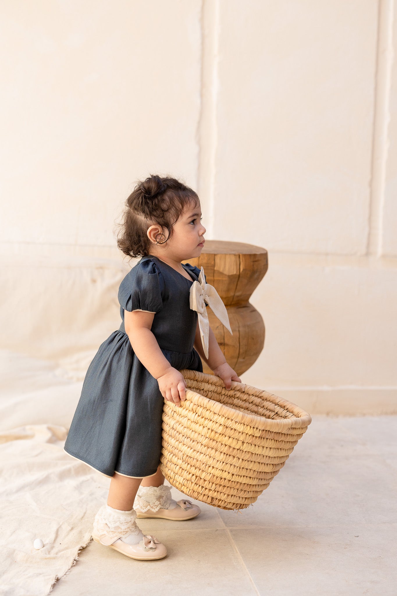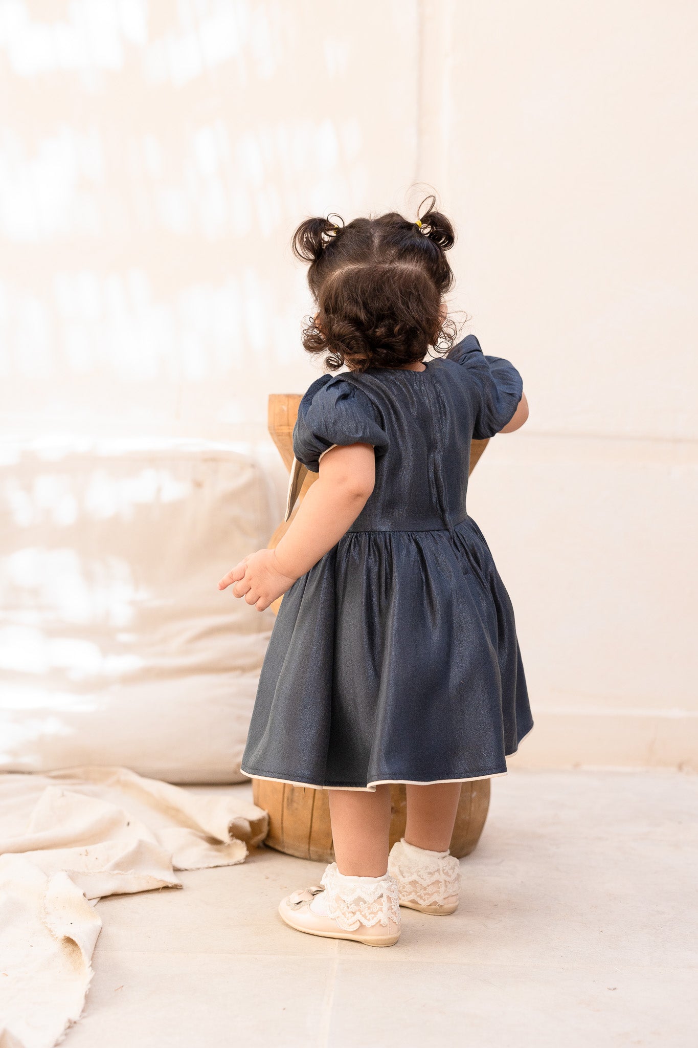Charming and classic, the Blue Bow Puff Sleeve Baby Dress is designed for little ones who love to dress up. Made from smooth satin in a soft blue tone, it features elegant puff sleeves and a delicate bow detail at the front, striking the perfect balance between playful and refined.