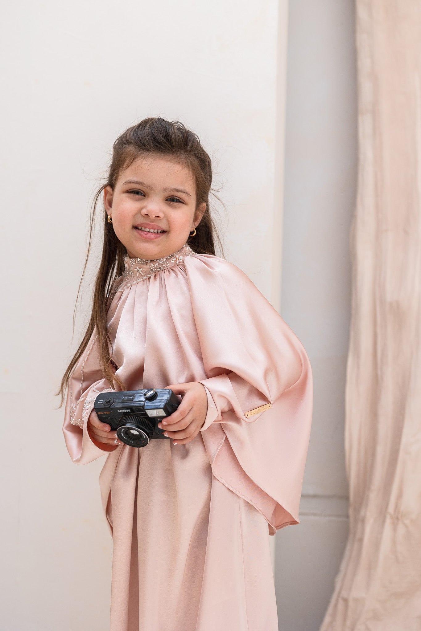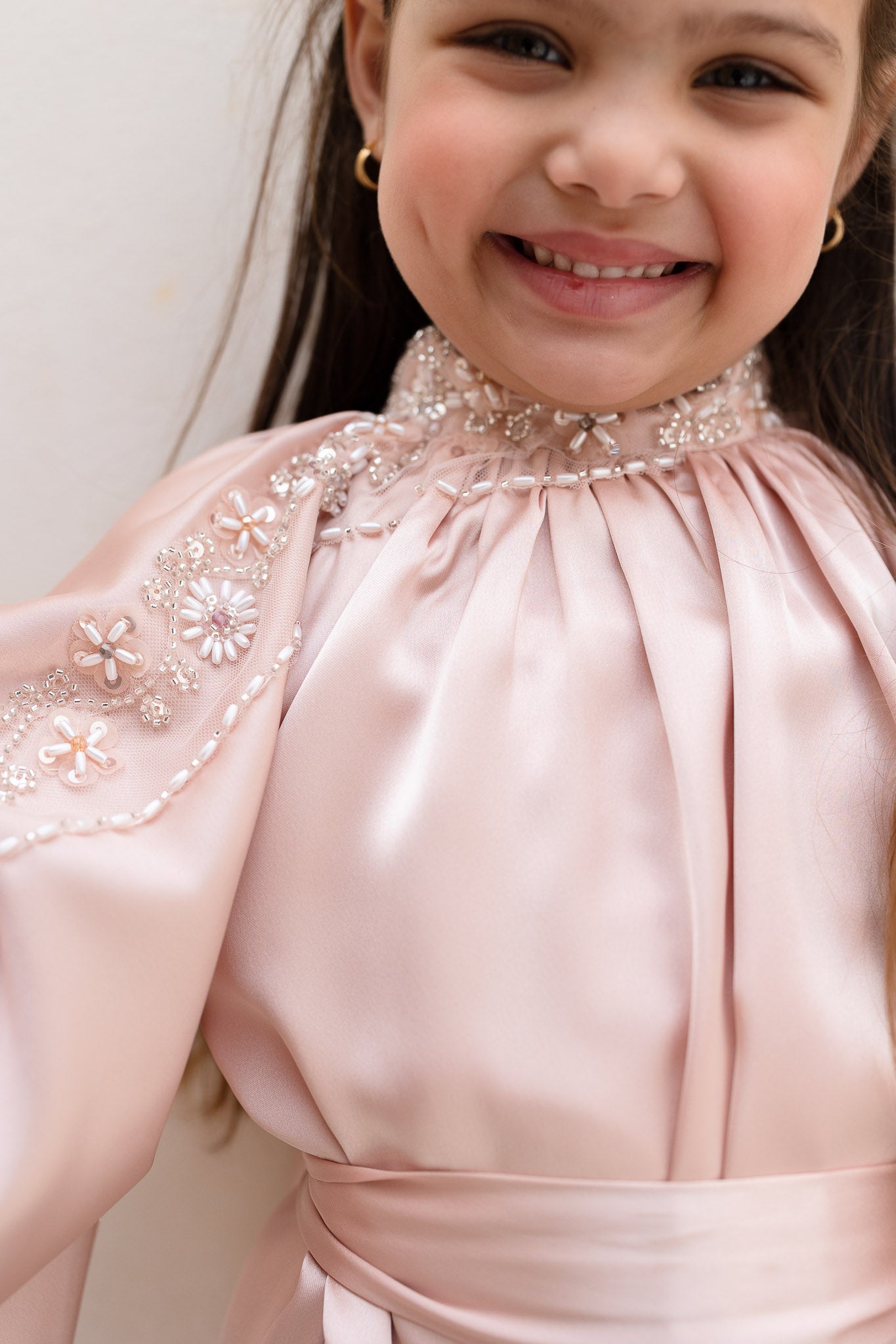 Sweet, elegant, and designed to match, the Blush Pink Embellished Satin Kids Abaya brings softness and shine to your little one’s wardrobe. Made from the same satin fabric as the Blush Pink Embellished Belted Satin Abaya, it features hand-applied embellishments along the bodice and sleeves for just the right amount of sparkle.