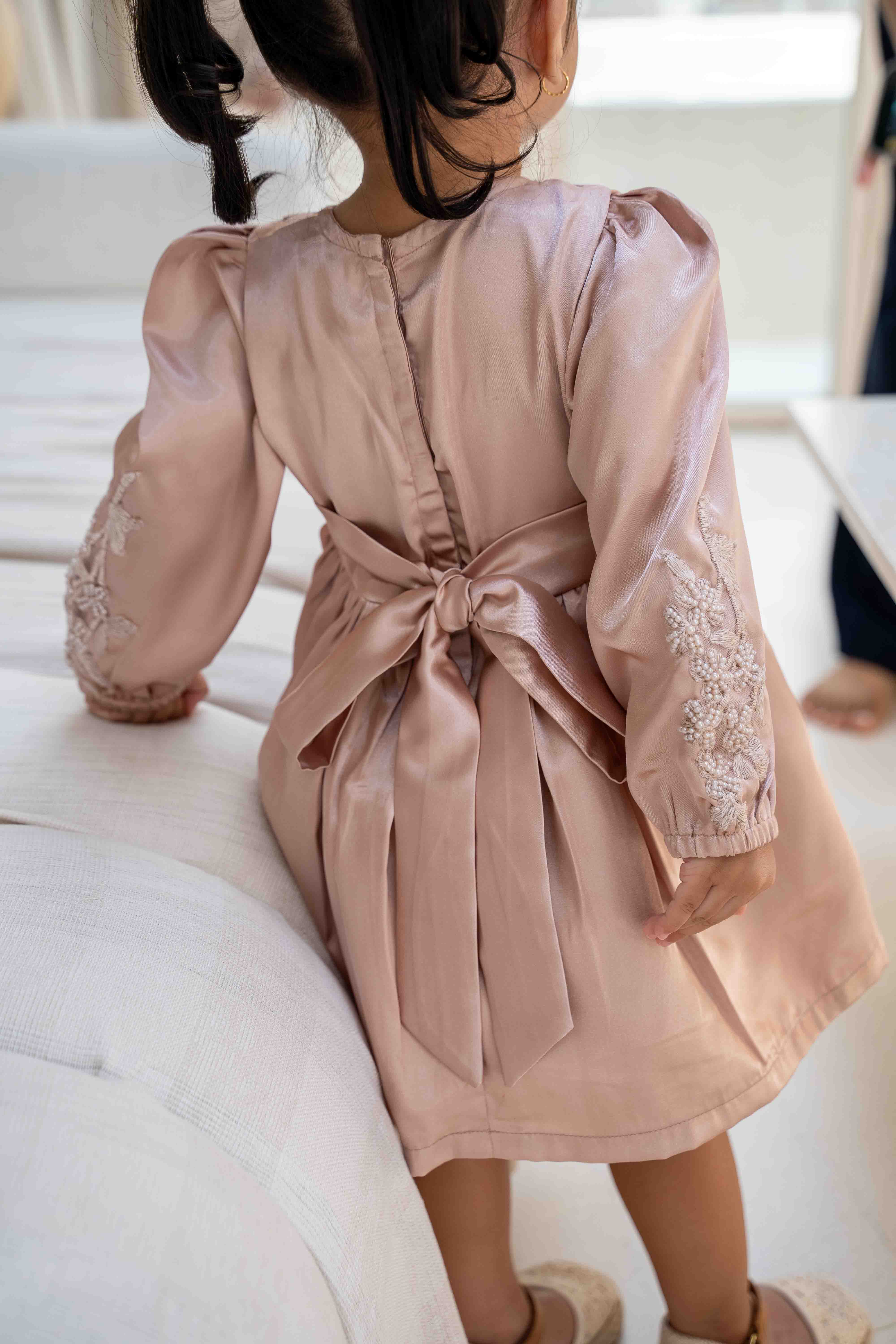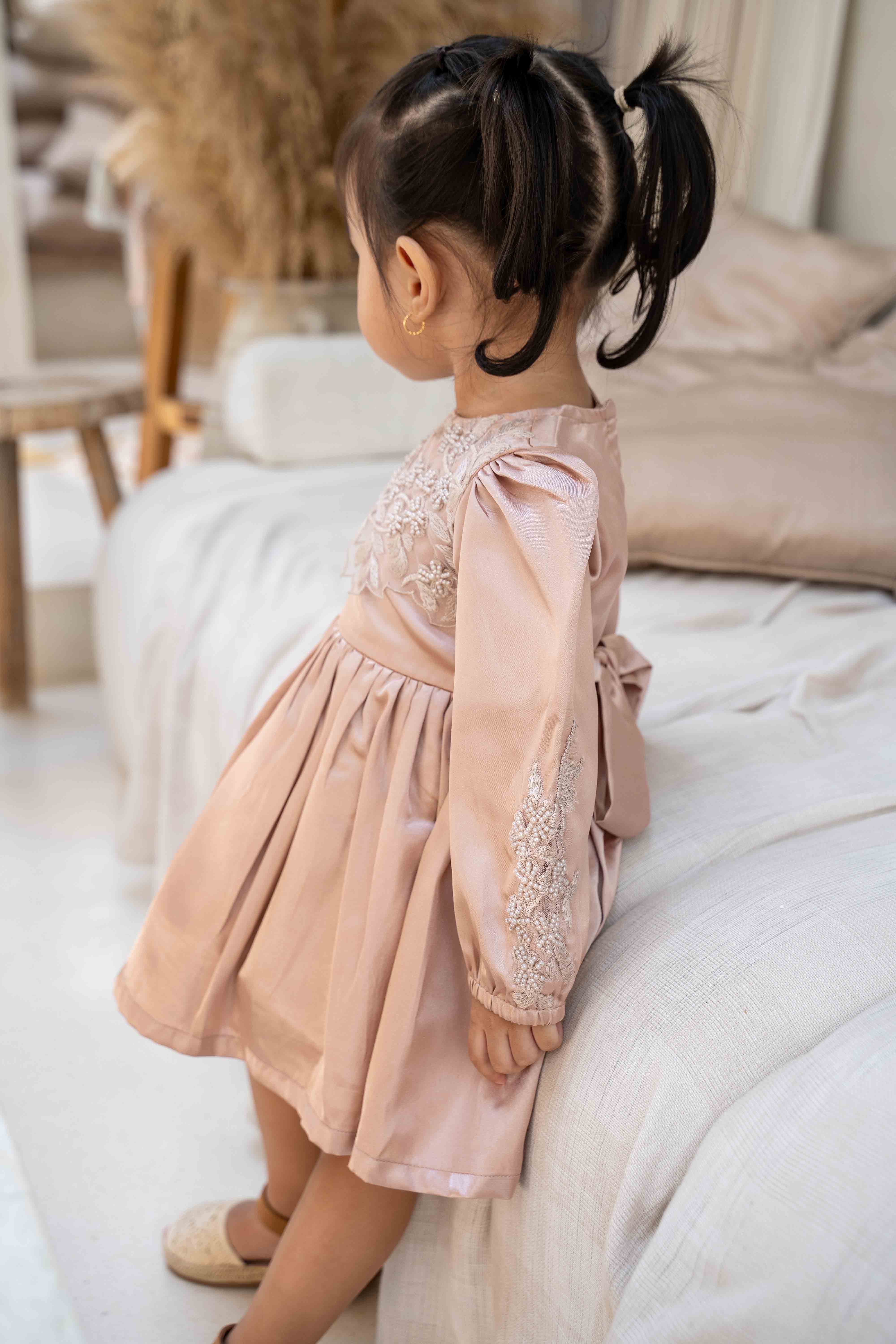 A dreamy blend of elegance and charm, the Blush Pink Embroidered Satin Baby Dress is designed for your little one's most special moments. Crafted from luxurious satin with delicate floral embroidery adorning the bodice and sleeves, this dress exudes timeless sophistication. The softly gathered skirt adds volume for a graceful silhouette, while the long puffed sleeves with embroidered cuffs offer a refined touch.