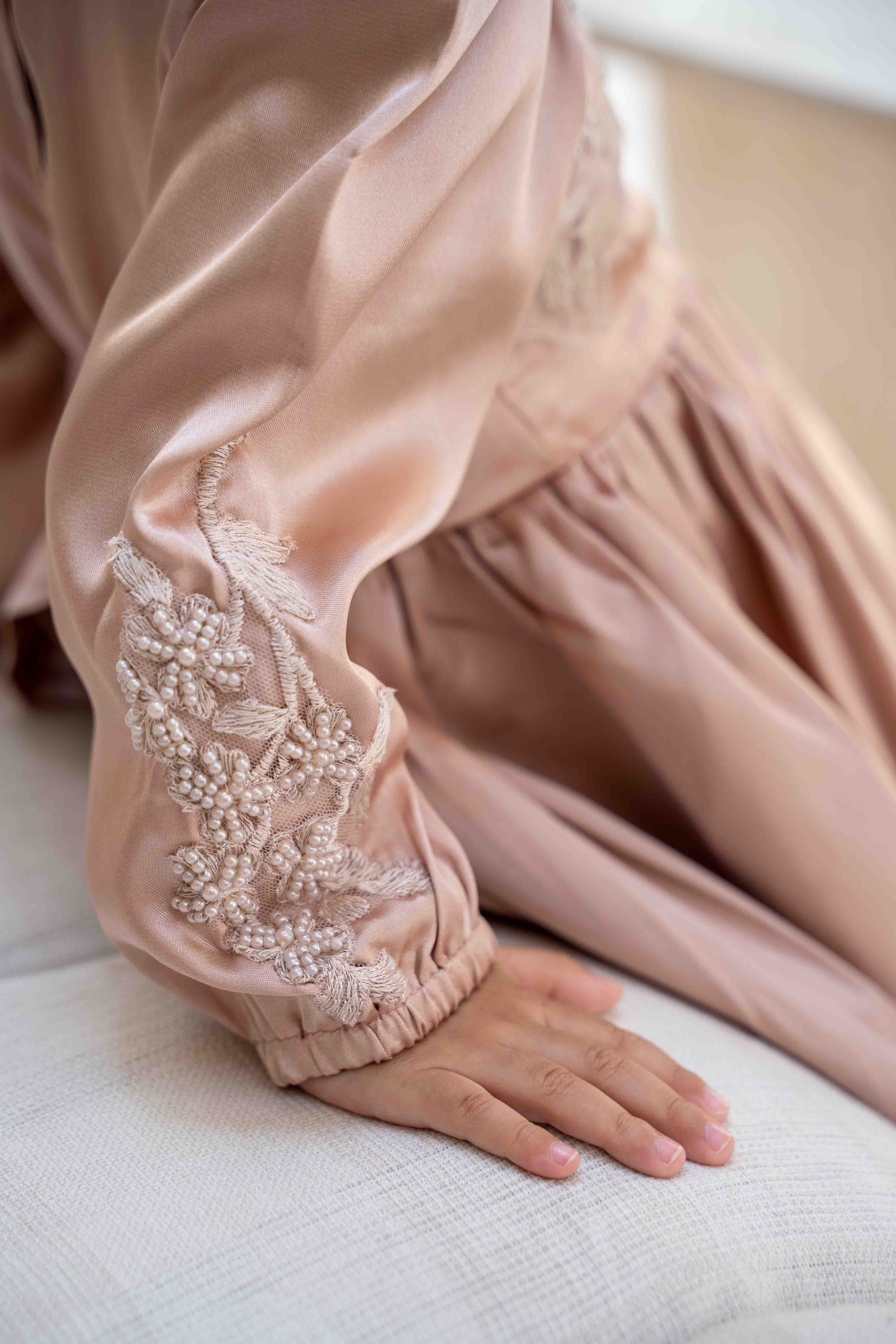 Perfect for weddings, Eid celebrations, birthdays, and formal gatherings, this dress ensures comfort with its smooth lining and gentle fit. The soft blush pink hue enhances its ethereal beauty, making it a must-have for every elegant occasion.