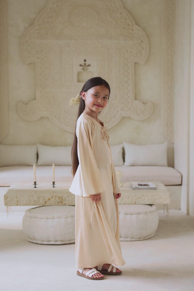 The Peach Ivory Kids Abaya brings an elegant and timeless touch to festive dressing. Crafted from satin-soft fabric in a warm yellow-ivory tone, it features intricate hand-embroidered detailing across the shoulder for added texture and sophistication. A built-in cinch waist with adjustable ties adds gentle structure to the silhouette, offering a flattering shape while ensuring comfort and freedom of movement throughout the day.