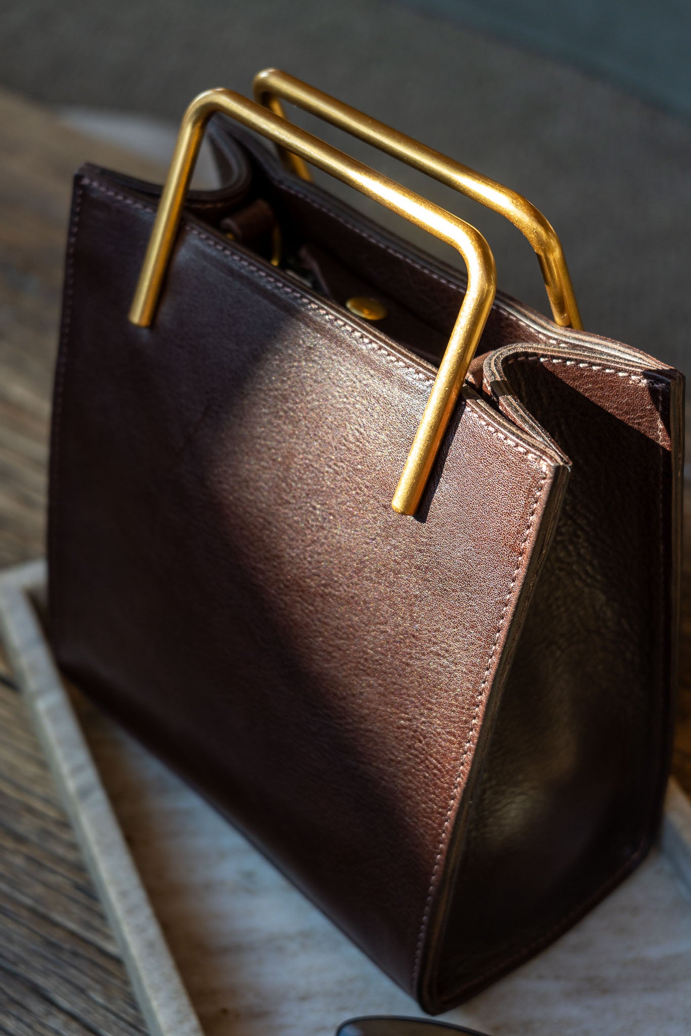 Harper Sculpted Mocha Leather Handbag - Gold Handle Tote