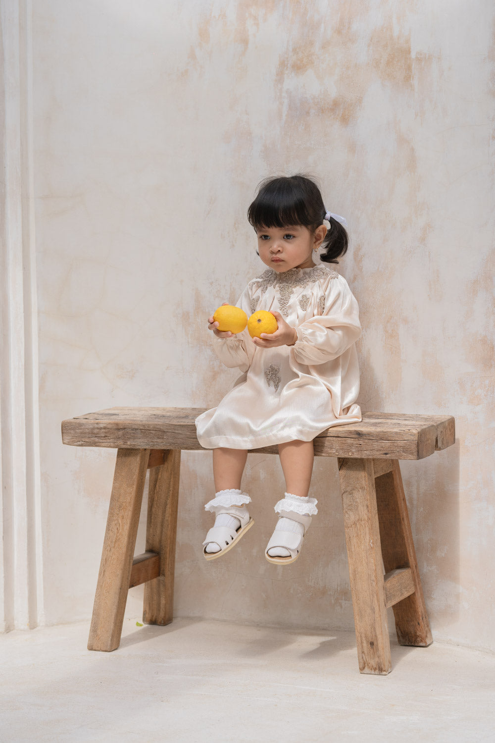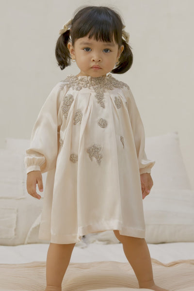 Delicate and elegant, this ivory beige satin dress showcases intricate embroidery and lace details, creating a look that is both graceful and refined. The smooth, luxurious fabric offers a soft feel, while the flowing skirt enhances its fairy-tale appeal. Whether it’s for a formal occasion or a magical celebration, this dress is sure to make your little one shine