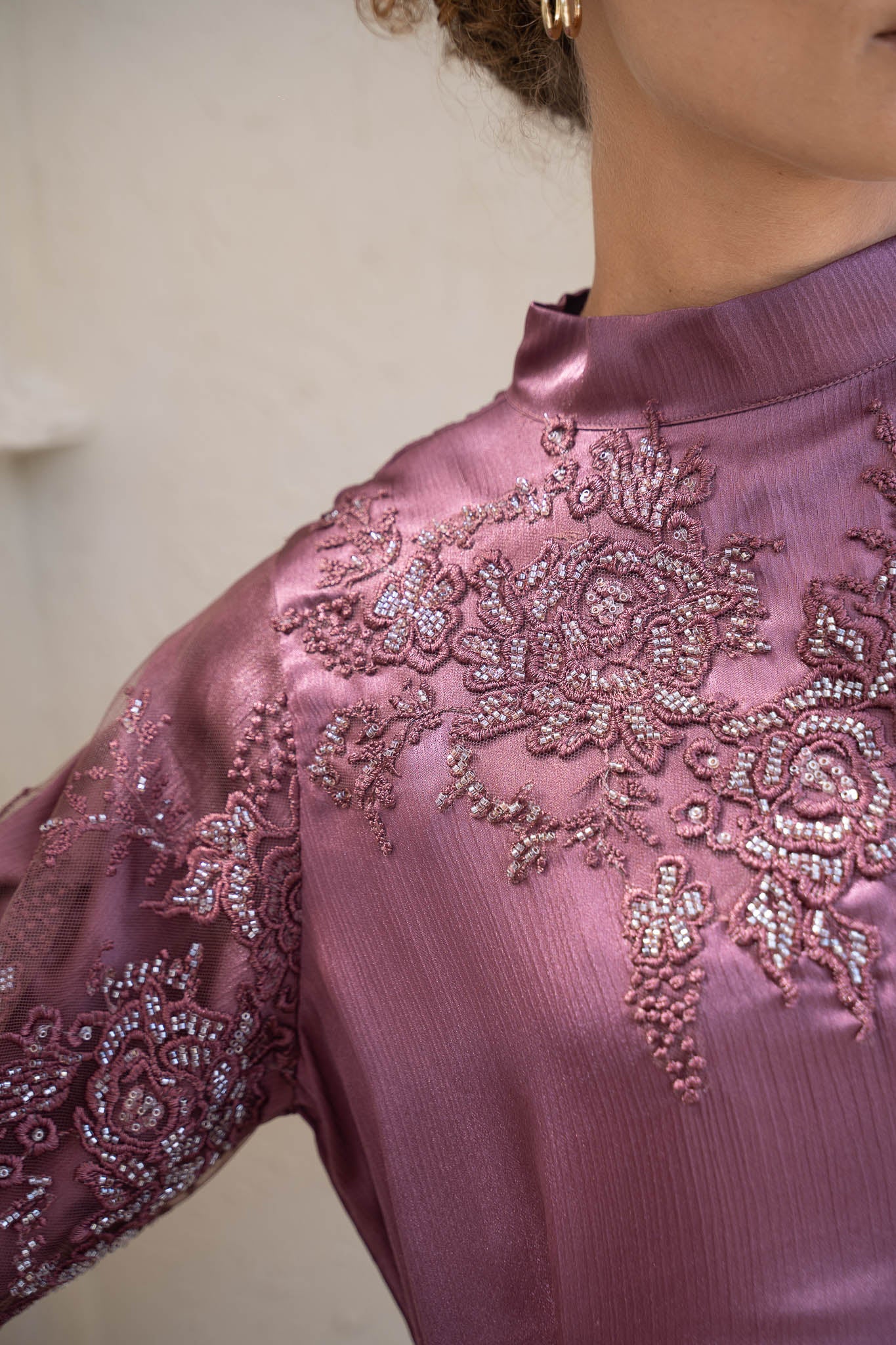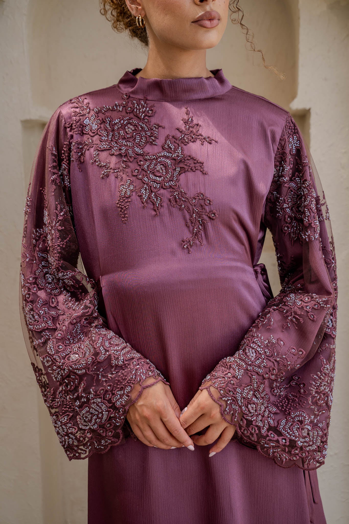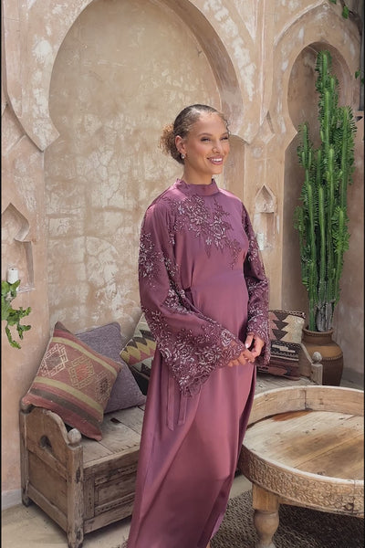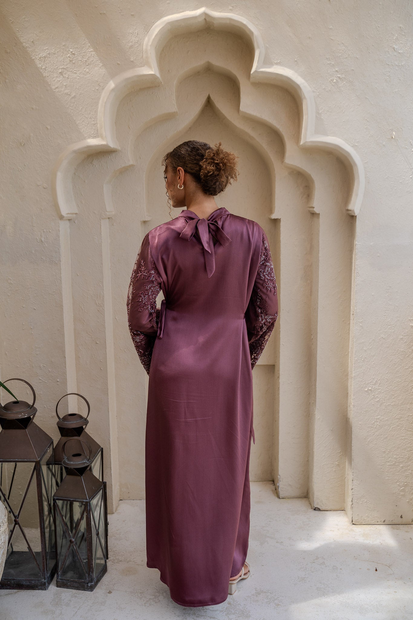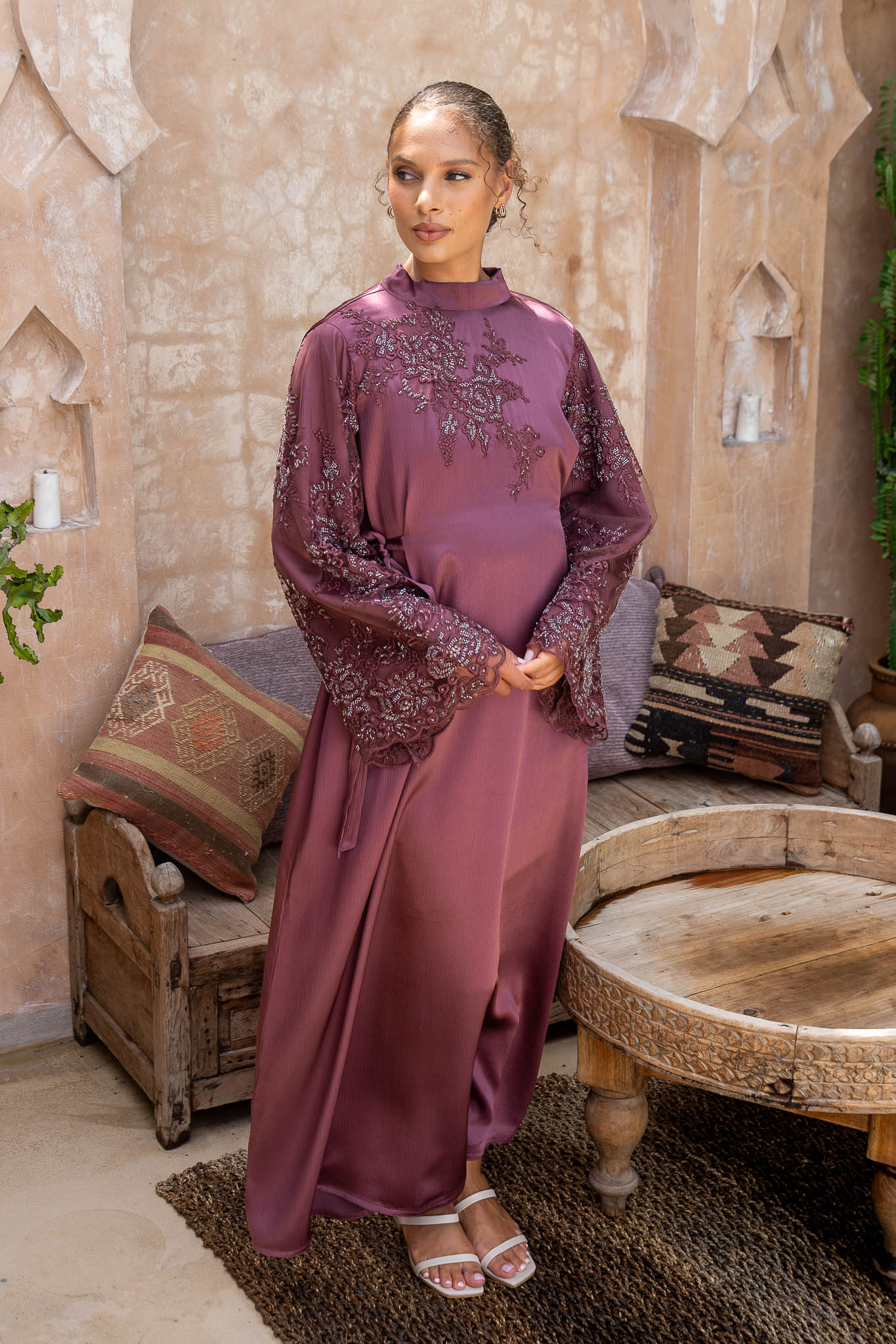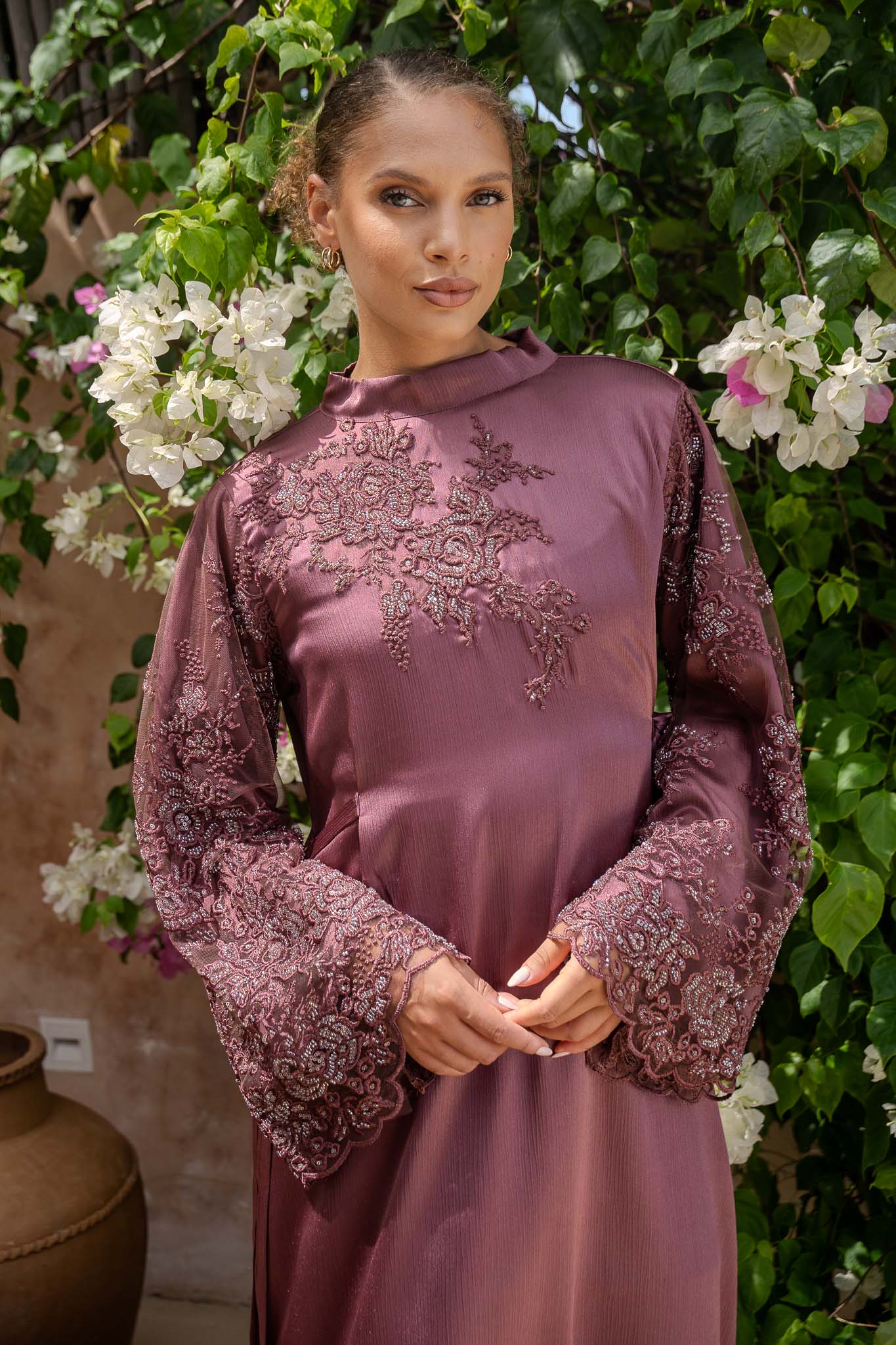 The smooth satin fabric enhances its fluidity, allowing the dress to move beautifully with you, while the classic high neckline and long sleeves maintain a refined, modest profile. Whether you're attending a formal celebration or a special occasion, the Plum Blooms Embellished Satin Abaya ensures you stand out with effortless elegance.