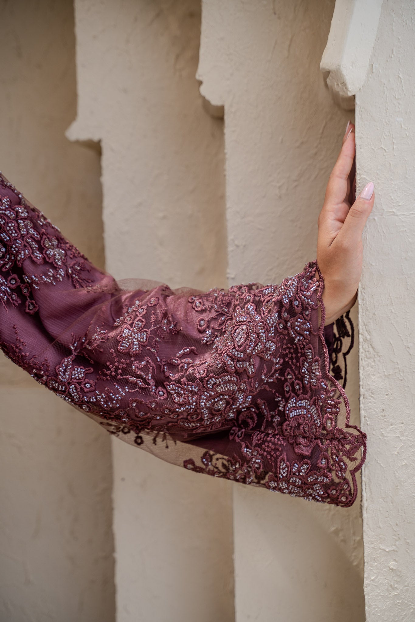 Add a touch of luxurious elegance to your wardrobe with the Plum Blooms Embellished Satin Abaya. Crafted from a luxe satin mix fabric, this abaya features a rich plum color that exudes sophistication and grace. The intricate embellished floral detailing adds a beautiful, artistic touch, elevating the overall design with subtle sparkle. Designed with a flowing, modest silhouette, the abaya offers both comfort and timeless style, making it ideal for formal gatherings, weddings, and evening events.