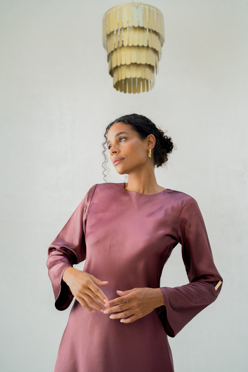 Crafted from luxurious, flowing fabric, the Regal Raspberry Dress ensures both comfort and a flattering drape that enhances your natural shape without compromising on modesty. The long sleeves and generous fit provide ease of movement, creating a demure yet stylish silhouette suitable for every special occasion.