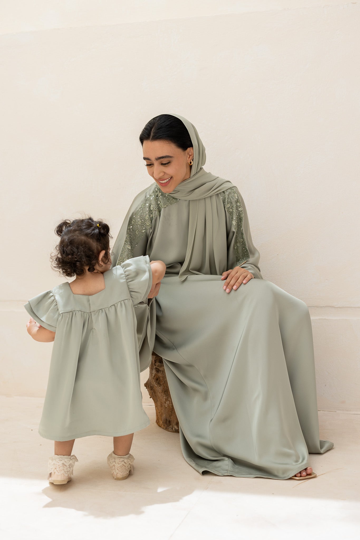 Soft, elegant, and thoughtfully designed, the Sage Green Embellished Cap Sleeve Baby Dress is a delicate piece for your little one’s most memorable moments. Made from smooth satin in a soothing sage green hue, this full-length dress features subtle embellishments and dainty cap sleeves for a timeless silhouette.