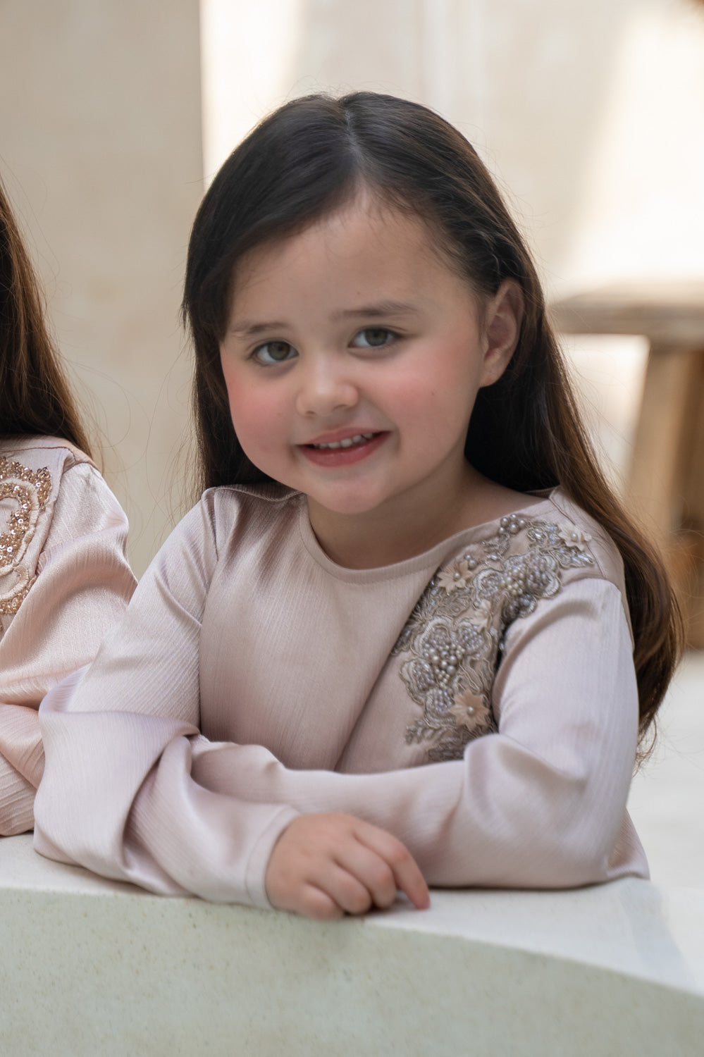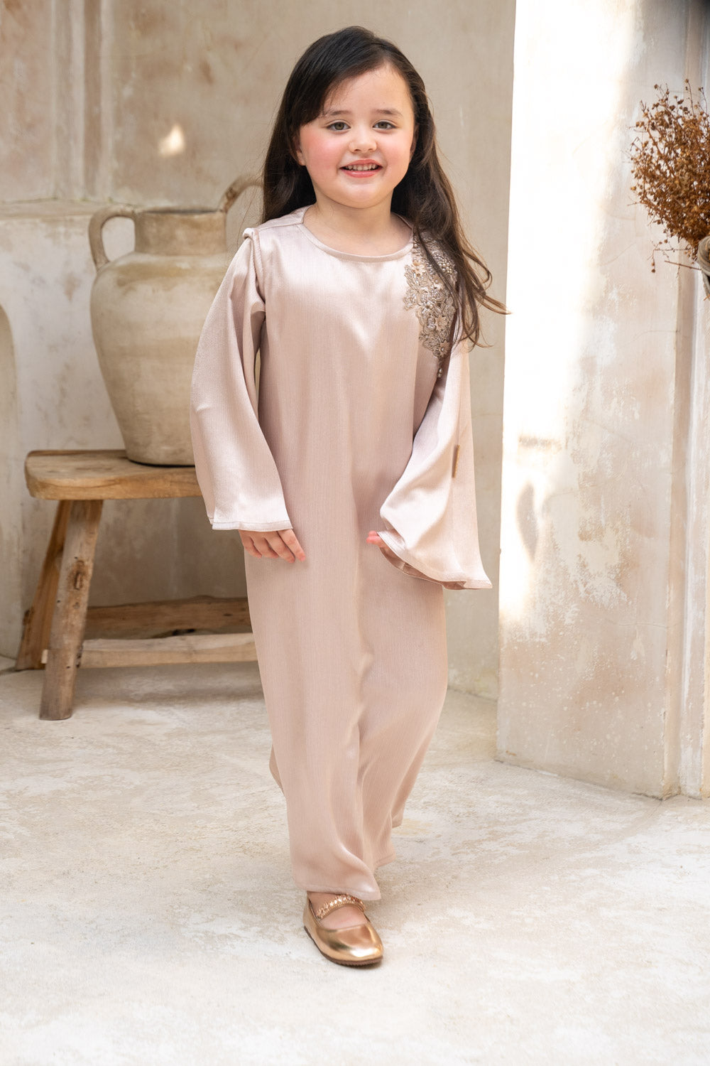 Elevate your child's wardrobe with the Silken Blush Charm Kids Abaya. Featuring a soft, flowing finish and delicate floral embroidery on the shoulder, this abaya blends comfort with sophistication. Wide bell sleeves add a graceful touch, while the loose fit ensures ease of movement. Perfect for Eid, Ramadan, and special occasions, its timeless champagne beige tone makes it a versatile must-have.