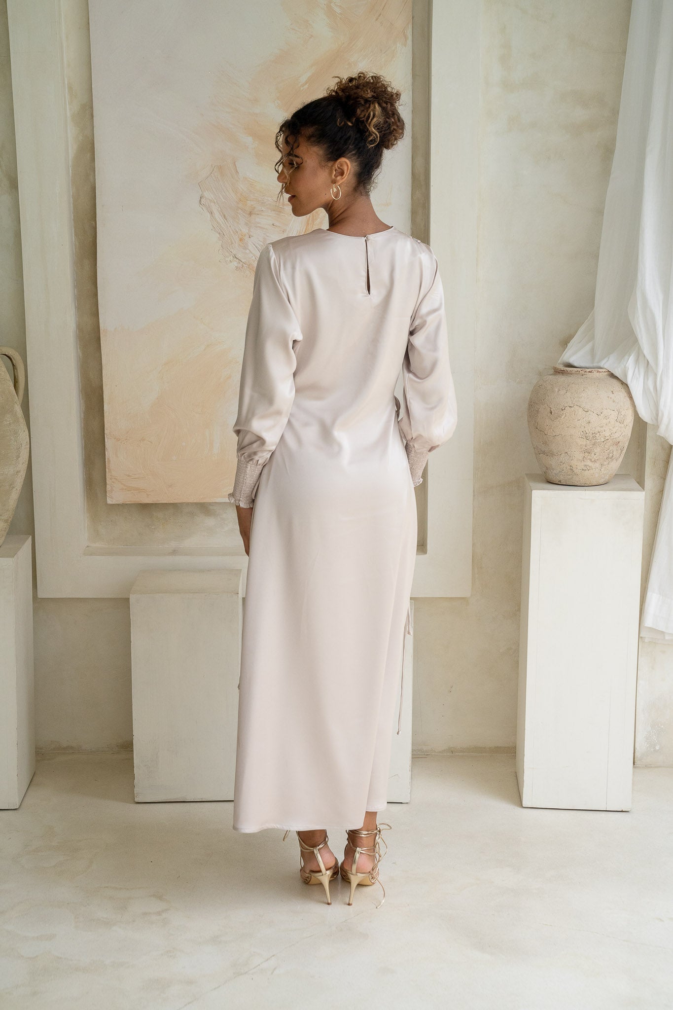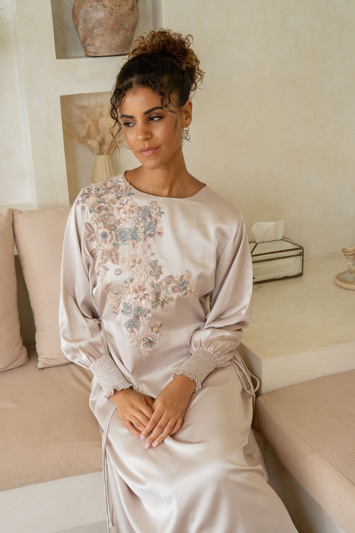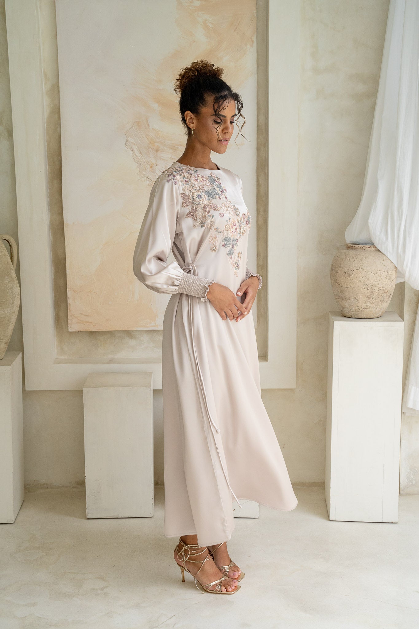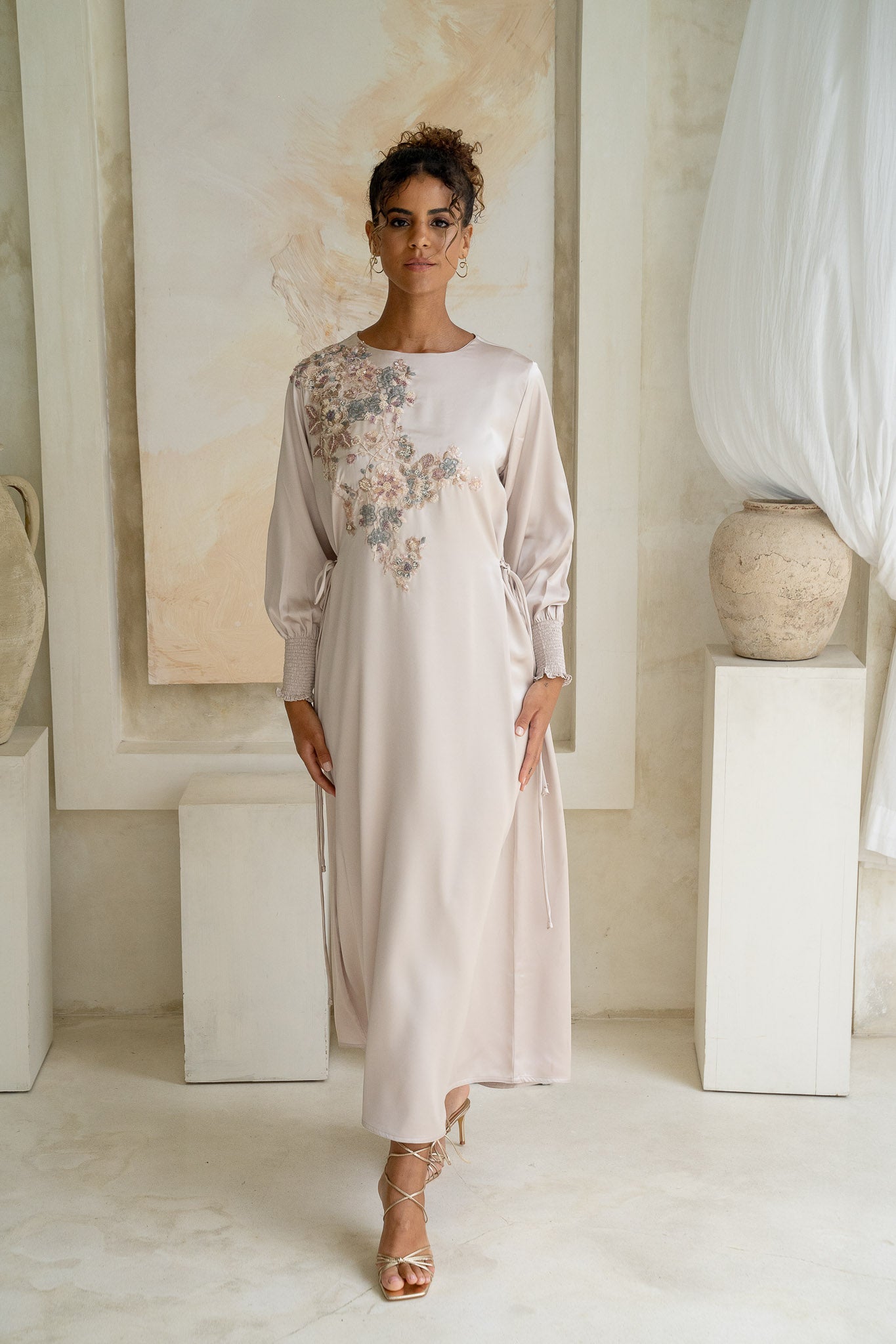 Refined elegance meets timeless beauty in the Stone-Beige Embellished Floral Cinch Abaya. Designed for a flattering silhouette, this modest yet sophisticated abaya features an adjustable cinched waist that enhances your shape while maintaining a graceful flow. Crafted from luxurious satin, it offers a soft, silky drape, while the intricate coloured floral embellishments add a delicate touch of glamour. The neutral stone-beige shade makes this piece versatile and effortlessly chic, perfect for weddings, Eid celebrations, and formal occasions.