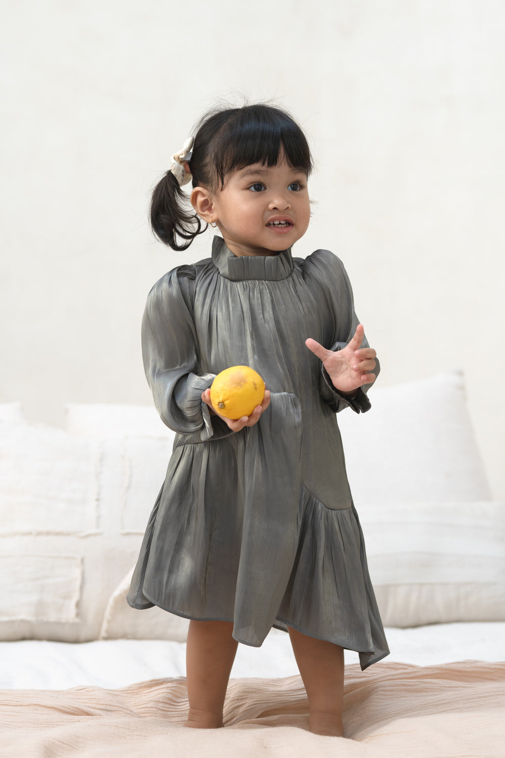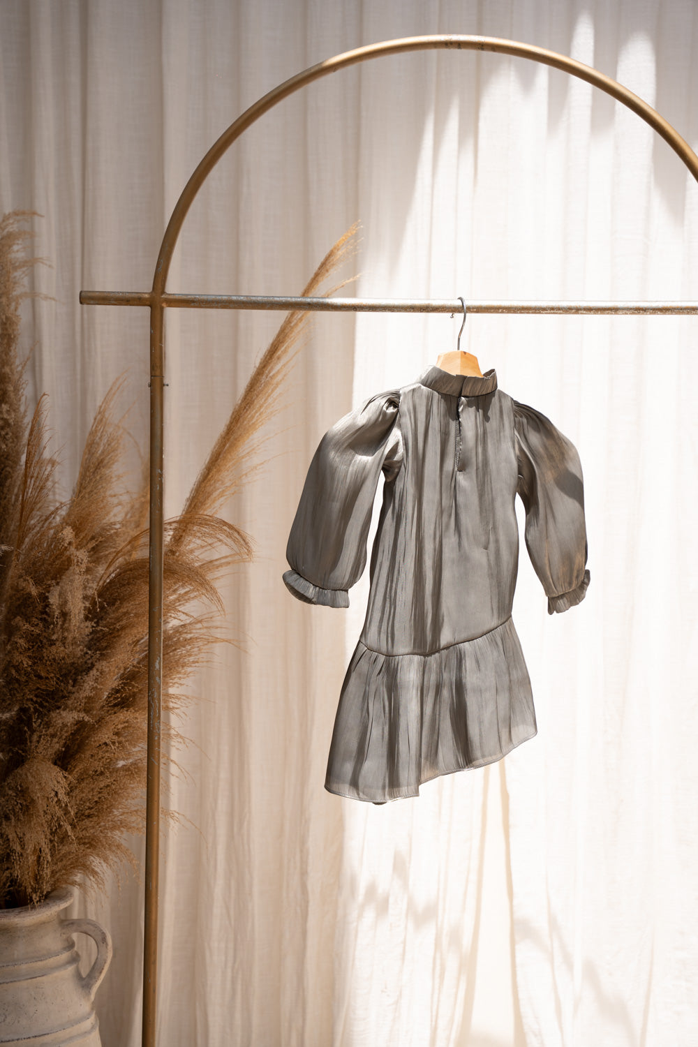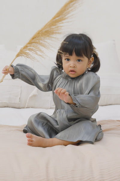 This sophisticated green-pewter dress features beautifully tailored pleats and long sleeves, combining a polished look with a touch of playful charm. The silky fabric drapes gracefully, offering both comfort and style. Perfect for family gatherings or festive events, this dress is a standout piece that will make your little one feel special.