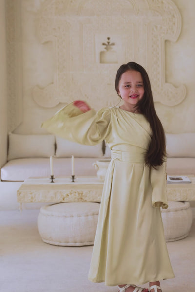 The Wrapped ivory cream Kids Abaya introduces a modern feel to festive dressing. Crafted from a satin-soft fabric in an ivory cream hue, it features a front wrap-style detailing that creates a flattering and comfortable fit for little ones. Delicate embellishment across the sleeve adds subtle texture and shimmer, elevating the look with a touch of elegance.